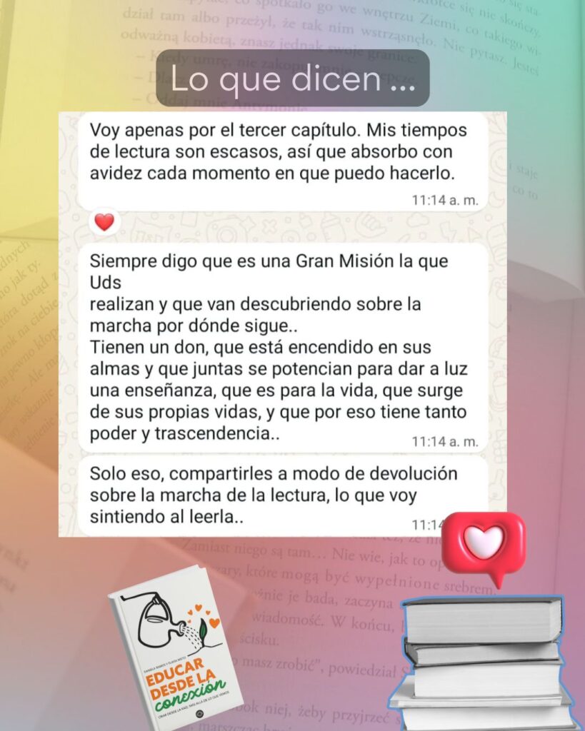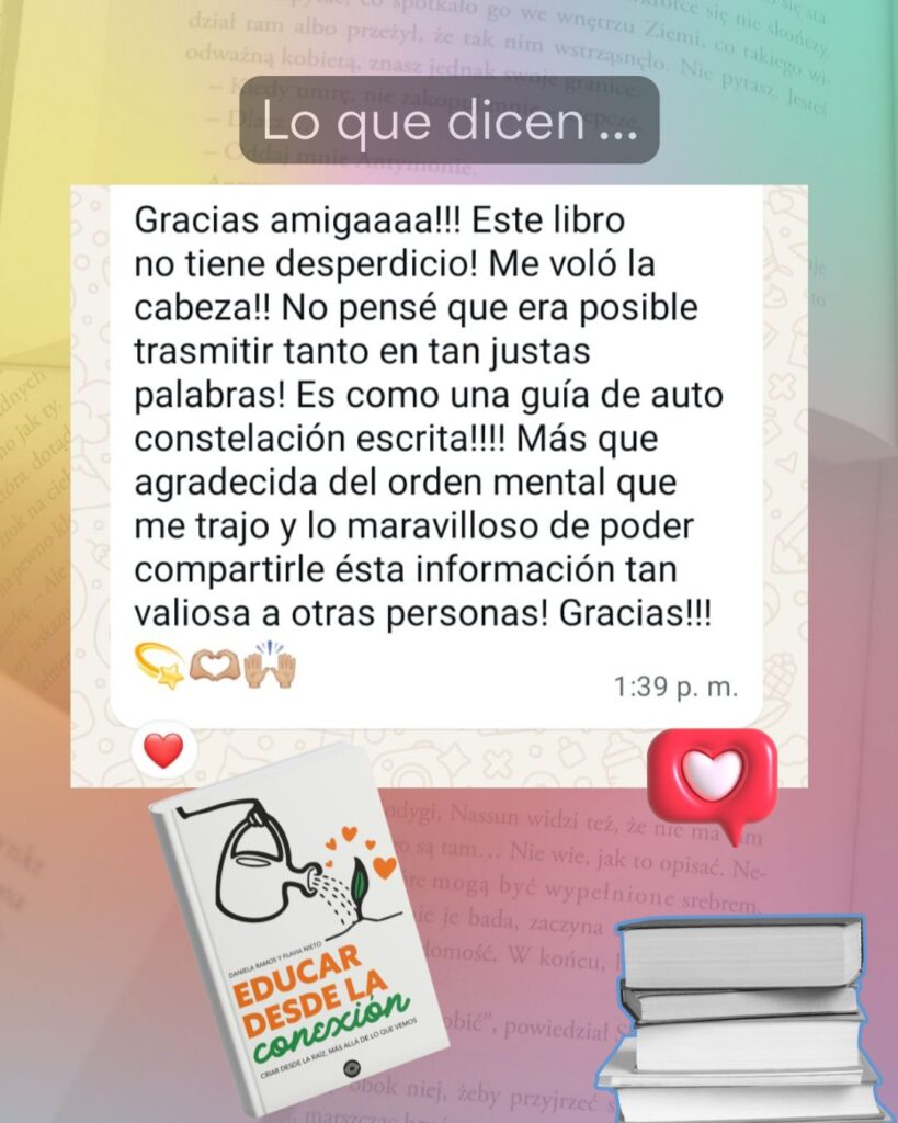 Una de las mayores alegrías de este camino es recibir los mensajes, comentarios y experiencias de quienes ya leyeron Educar desde la conexión. Cada testimonio refleja cómo este libro no es solo teoría, sino una guía viva que toca corazones, abre nuevas miradas y transforma vínculos.